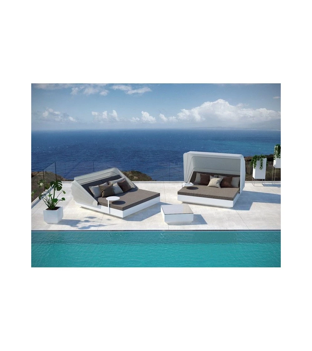 En option : coussin de confort 60×60 cm dans le même tissu pour l’extérieur, table d’appoint, haut-parleur Bluetooth 200W intégré au mobilier.