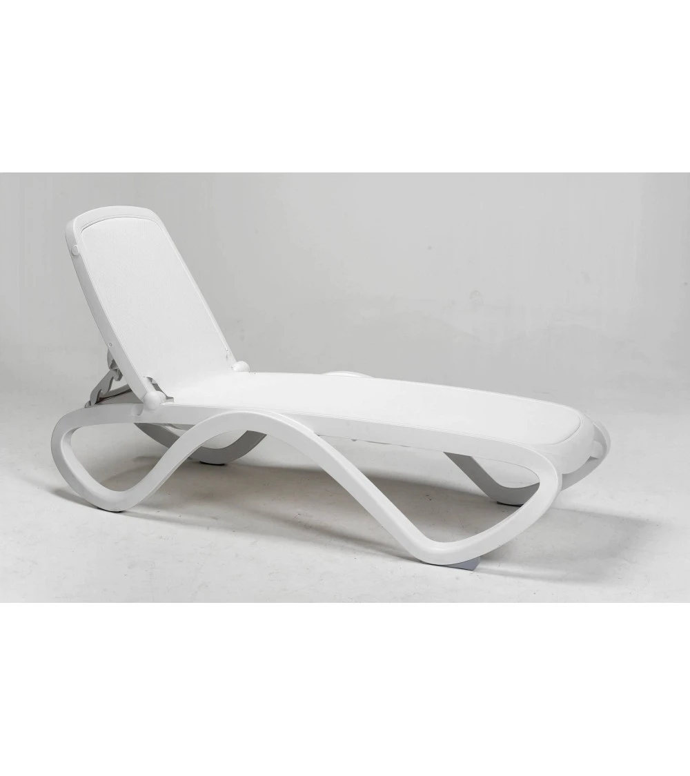 Bain de Soleil oméga de nardi sans accoudoir, siège rehaussé. Structure tubulaire en résine, habillage en tissu synthétique aéré (interchangeable), empilable, dossier réglable 4 positions, patins anti-dérapant et roues intégrées.