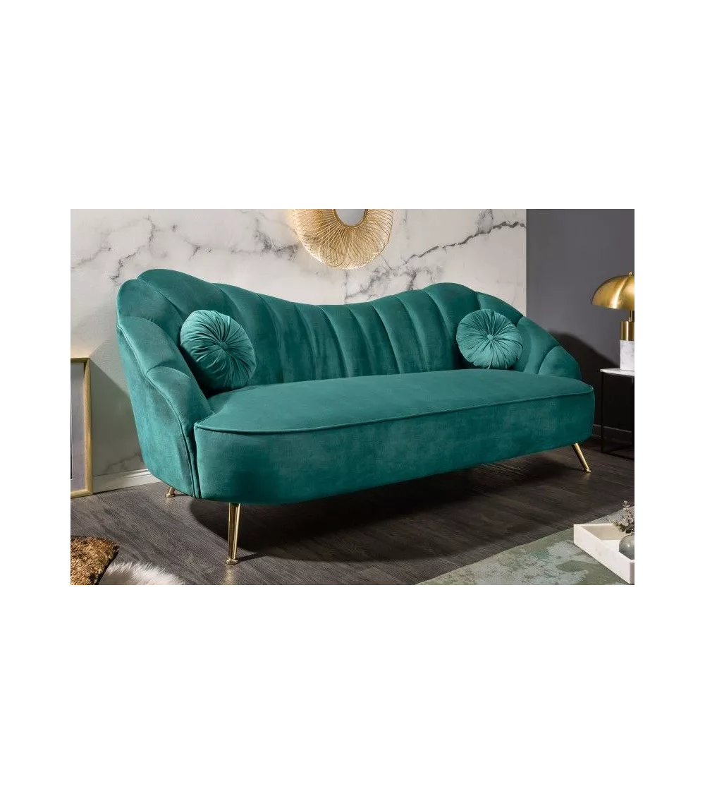 Un canapé trois places 220 cm Arielle original tout en rondeur. Sa forme incurvée et celle de ses coussins rappelle celle d’un coquillage. Vous apprécierez ses pieds évasés, qui lui donnent un certain caractère. Un canapé tout en velours, qui existe aussi dans d’autres coloris.