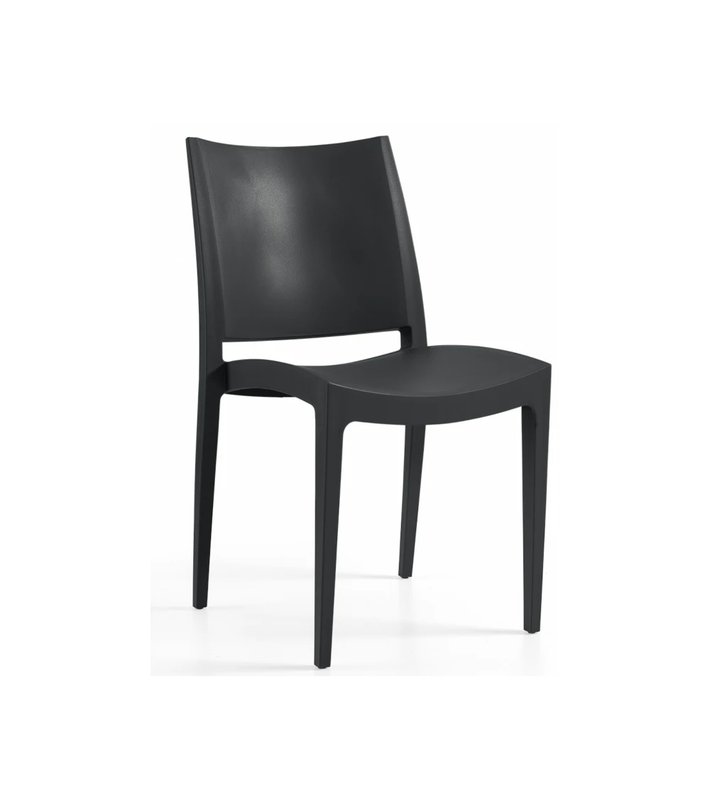 Chaise Libby, siège monobloc très confortable et résistante, bonne tenue, polypropylène avec un design soigné. Cette chaise est empilable, résiste aux agressions extérieures. Elle s’intègre parfaitement en intérieur extérieur .Chaise contract pour café hôtel restaurant.