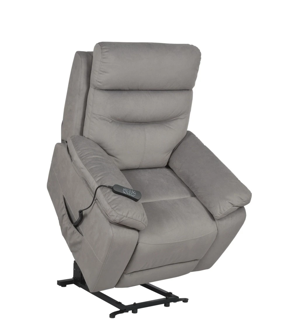 Fauteuil releveur grand confort avec 2 moteurs pour une combinaison infinie de positions et une têtière ajustable en inclinaison par un mécanisme manuel.
