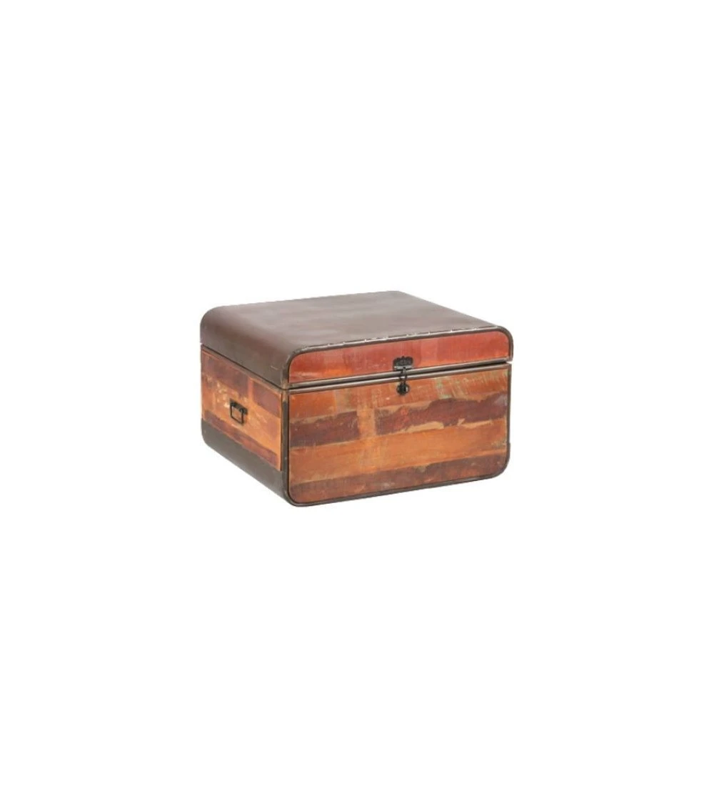 Voici une malle pouvant vous servir de table basse. Celle-ci possÚde une structure en acier et a été fabriquée par Meubles du monde.