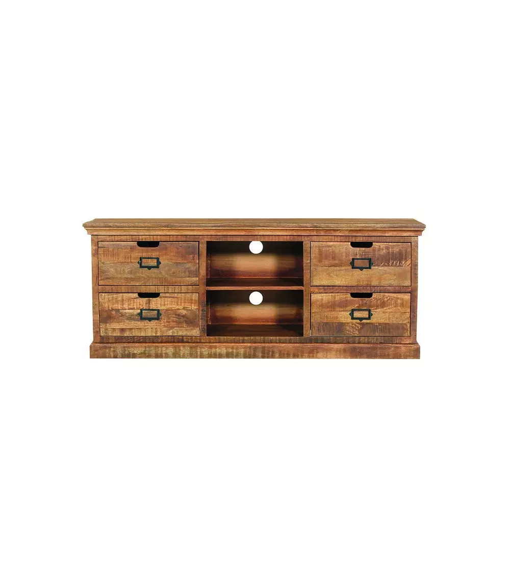 Meuble TV, 4 tiroirs, 2 niches, Manguier massif, finition vernis nitro cellulosique, fond et fonds de tiroirs plaqués.