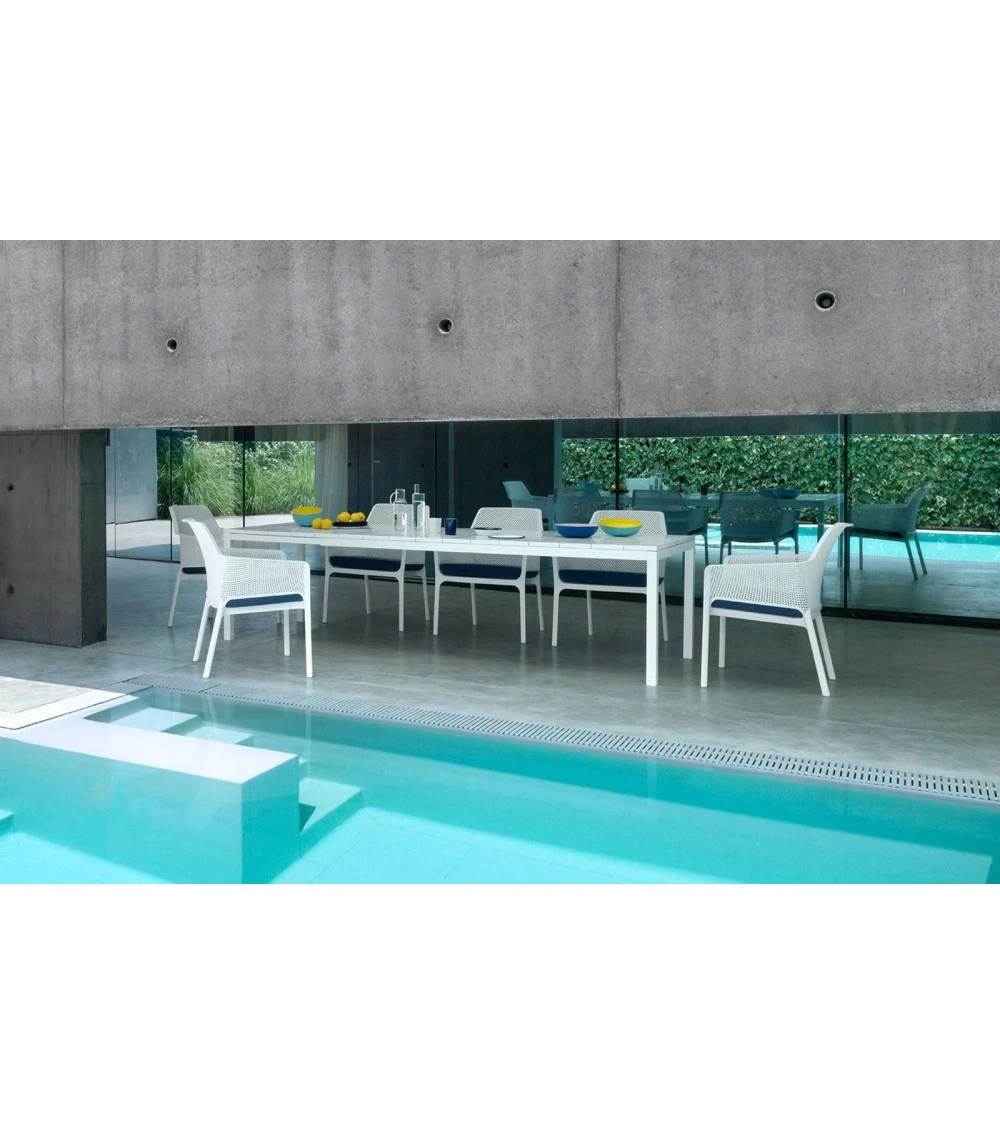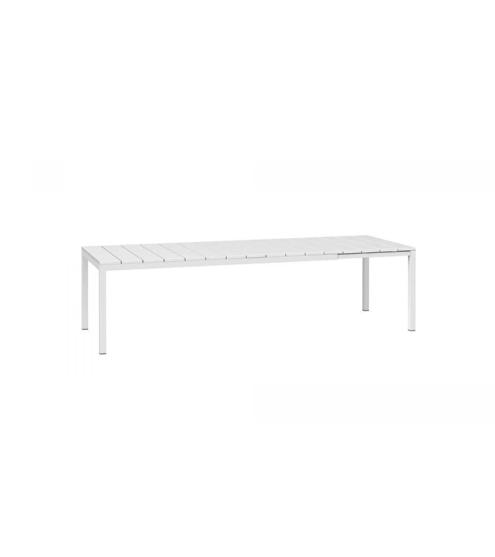 Table extensible. Plateau DurelTOP en polypropyleÌne traiteÌ anti-UV et coloreÌ dans la masse. Pieds en aluminium vernis. Effet mat. VĂ©rins de rĂ©glage.