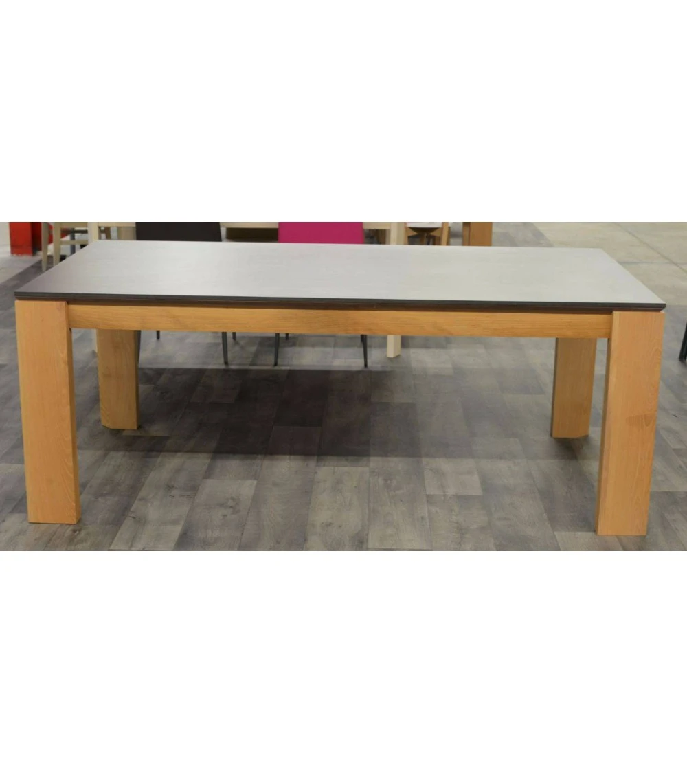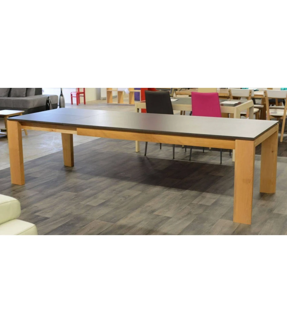 Très belle table à manger entièrement en bois massif montée sur 4 pieds de section 162x62mm et traverses 92x31mm. Installer rapidement son allonge de 50/80cm grâce à sa grande facilité d’ouverture, ses 4 roulements à billes et ses pieds sur roulettes.